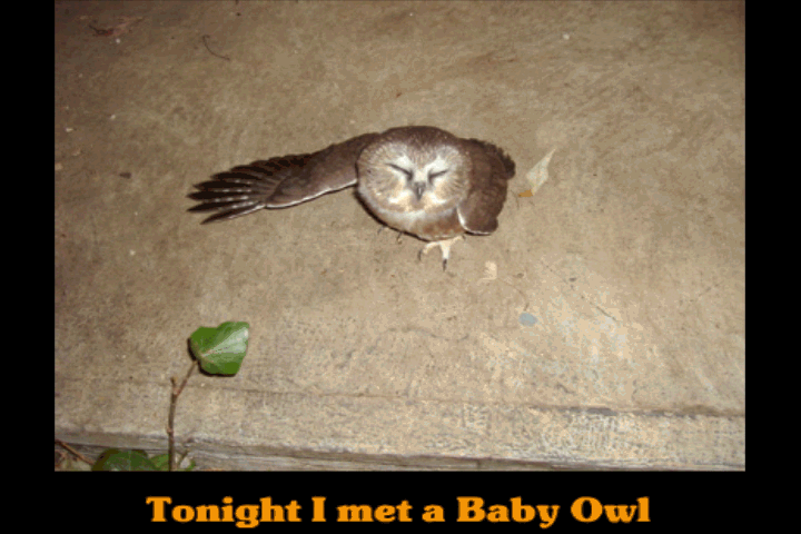 I was in my office a minute ago and I heard a huge thump on the sliding glass door. I looked to see what it was, and a baby owl was on the deck, stunned. He was only about 6 inches tall. I went outside and spoke softly to the baby owl. (I have only seen an owl once before in my life, it was sitting on a post.) Then I got the camera.
